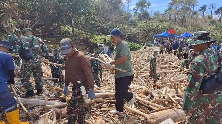 Sinergi Tanpa Batas TNI dan Warga ‘Geruduk’ Pantai Pancur Bersihkan Sampah Kayu