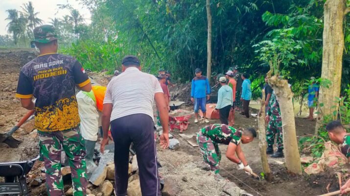 Banyuwangi – Minggu, 27 Juli 2025, suasana pagi di salah satu sudut Kecamatan Siliragung tampak berbeda. Deretan prajurit TNI bersama warga tampak sibuk mengaduk semen, mengangkat batu, dan membentuk struktur fondasi jembatan yang akan menjadi penghubung antar desa. Inilah semangat nyata TMMD ke-125 Kodim 0825/Banyuwangi: kerja bersama untuk kemajuan desa.
