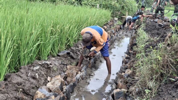 Dengan penuh semangat, para prajurit TNI turun langsung ke lokasi, bergelut dengan lumpur dan batu untuk membentuk saluran irigasi yang kokoh dan fungsional. Tak sendiri, mereka ditemani oleh warga yang tak kalah antusias. Suasana keakraban dan kekompakan terlihat jelas, mencerminkan sinergi nyata antara TNI dan rakyat.