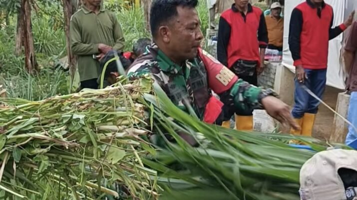 Sejumlah anggota Satgas tampak aktif membantu warga, terutama peternak kecil, dalam proses pencampuran bahan dan pengemasan hasil fermentasi.