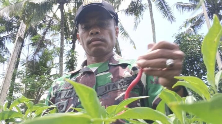 ‎Dengan tangan penuh lumpur dan senyum tulus, Serda Israil ikut memetik cabai bersama para petani. Tak ada sekat antara seragam loreng dan pakaian sederhana warga.