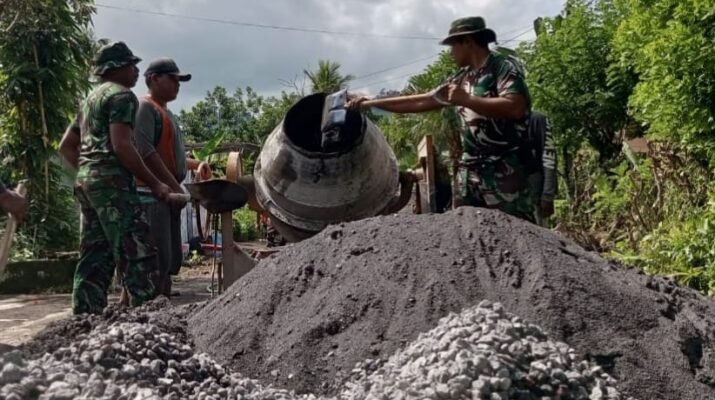 ‎Suara mesin molen, serok pasir dan batu koral berpadu menjadi irama kebersamaan. Bagi prajurit TNI, setiap ayunan sekop dan cangkul bukan sekadar pekerjaan fisik, tetapi wujud pengabdian untuk membantu masyarakat desa agar terhindar dari genangan air dan memperlancar aliran irigasi sawah.