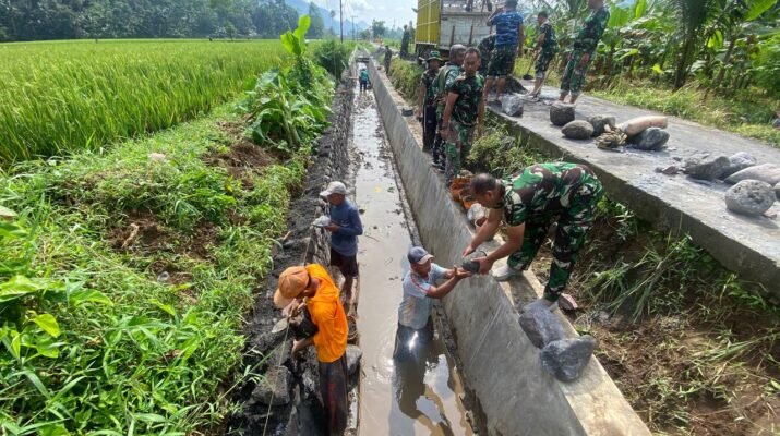 Semangat gotong royong terlihat jelas di lokasi. Warga bersama anggota TNI saling membantu, mulai dari penggalian tanah, pemasangan batu kali, hingga pengecoran dinding irigasi. Cuaca yang tidak menentu tidak menyurutkan semangat mereka untuk terus bekerja.