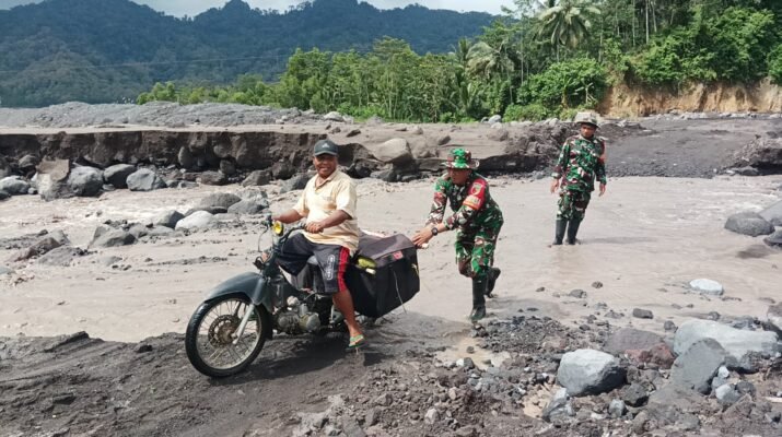 Lumajang – Di tengah cuaca yang tidak menentu dan aktivitas lahar dingin yang masih terjadi pasca-erupsi Gunung Semeru, Personel TNI kembali menunjukkan komitmen kemanusiaan mereka. Dengan penuh dedikasi, para personel membantu warga yang kesulitan melintasi jalur terdampak material vulkanik di wilayah rawan bencana, Jumat (28/11/2025).