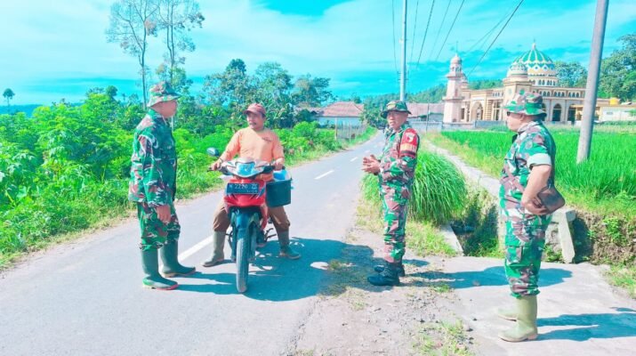 Lumajang – Upaya penanggulangan bencana pasca erupsi Gunung Semeru kembali diperkuat melalui pengawasan ketat terhadap mobilitas warga di wilayah rawan. Tim Satgas penanggulangan Kodim 0821 Lumajang Peltu Eko Budianto Bati Tuud Koramil 0821-05/Klakah, bersama lima personel melaksanakan kegiatan penyekatan dan pemantauan pergerakan masyarakat di kawasan Kamar A, Dusun Sumbersari, Desa Supiturang, Kecamatan Pronojiwo, pada Minggu (30/11/2025).