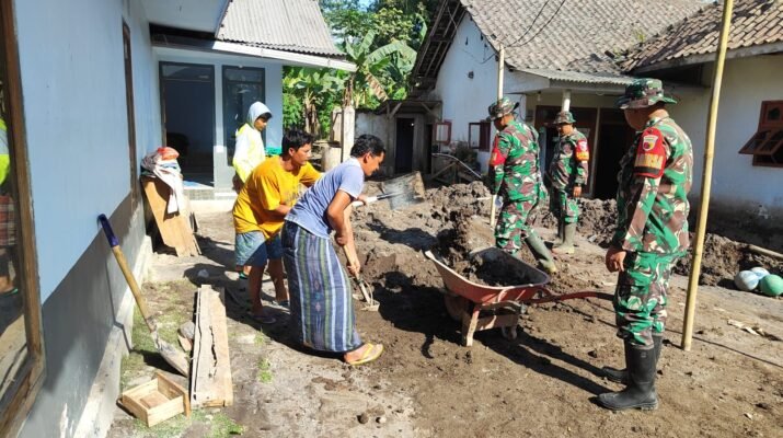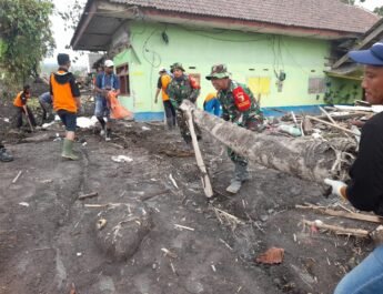 Lumajang – Upaya pemulihan pasca erupsi Gunung Semeru terus digencarkan. Personel gabungan Kodim 0821/Lumajang dan Yonif 527/BY turun langsung membantu warga membersihkan material vulkanik yang menimbun halaman serta bagian dalam rumah di Dusun Sumbersari, Desa Supiturang, Kecamatan Pronojiwo, Lumajang, Senin (1/12/2025).
