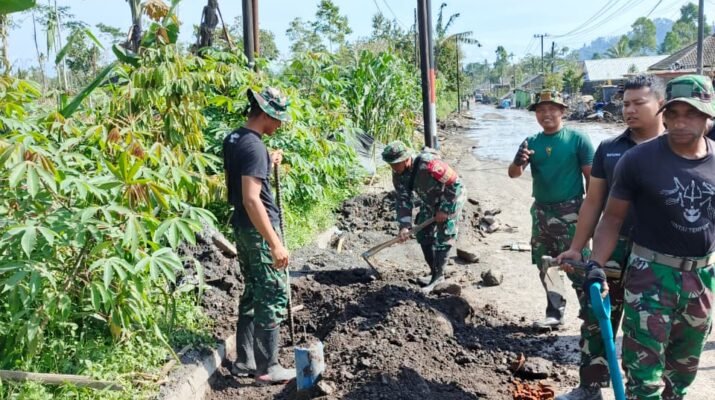 Lumajang — Personel Koramil 0821-14/Pronojiwo bersama Personel Yonif 527/BY melaksanakan kegiatan pengerukan saluran irigasi yang tertimbun material vulkanik di sepanjang jalur pertanian warga, Senin (1/12/2025). Kegiatan ini dilakukan sebagai langkah antisipasi terhadap potensi banjir lahar dingin sekaligus memastikan aliran air menuju lahan pertanian tetap lancar.