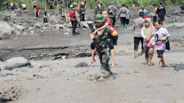 Dengan seragam lapangan yang basah dan lumpur yang mencapai lutut, Sertu Joko Pramono tetap melangkah mantap dan penuh kehati-hatian, memastikan anak tersebut mencapai tempat aman. Di belakangnya, warga tampak berjalan perlahan mengikuti arahan, sementara personel TNI dan Polri lainnya menjaga jalur evakuasi serta memantau perkembangan debit aliran lahar.