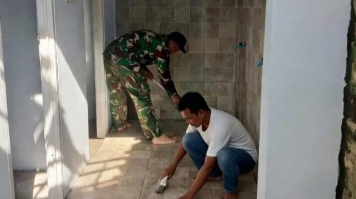 Satgas TNI Manunggal Membangun Desa (TMMD) Reguler Ke-127 Kodim 0819/Pasuruan kembali menunjukkan kepedulian terhadap fasilitas ibadah masyarakat. Prajurit Satgas melaksanakan pembersihan dan finishing kamar mandi (MCK) di Mushola milik Ibu Yuyun, Desa Wonosari, Kecamatan Gondangwetan, Kabupaten Pasuruan, Senin (9/3/2026).