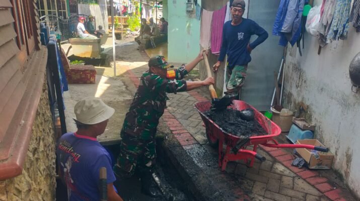 Giri – Dalam rangka mendukung upaya pencegahan banjir di wilayah binaannya, Babinsa Kelurahan Penataban Koramil 0825/02 Giri, Sertu Hermanto, melaksanakan kegiatan kerja bakti pembangunan
